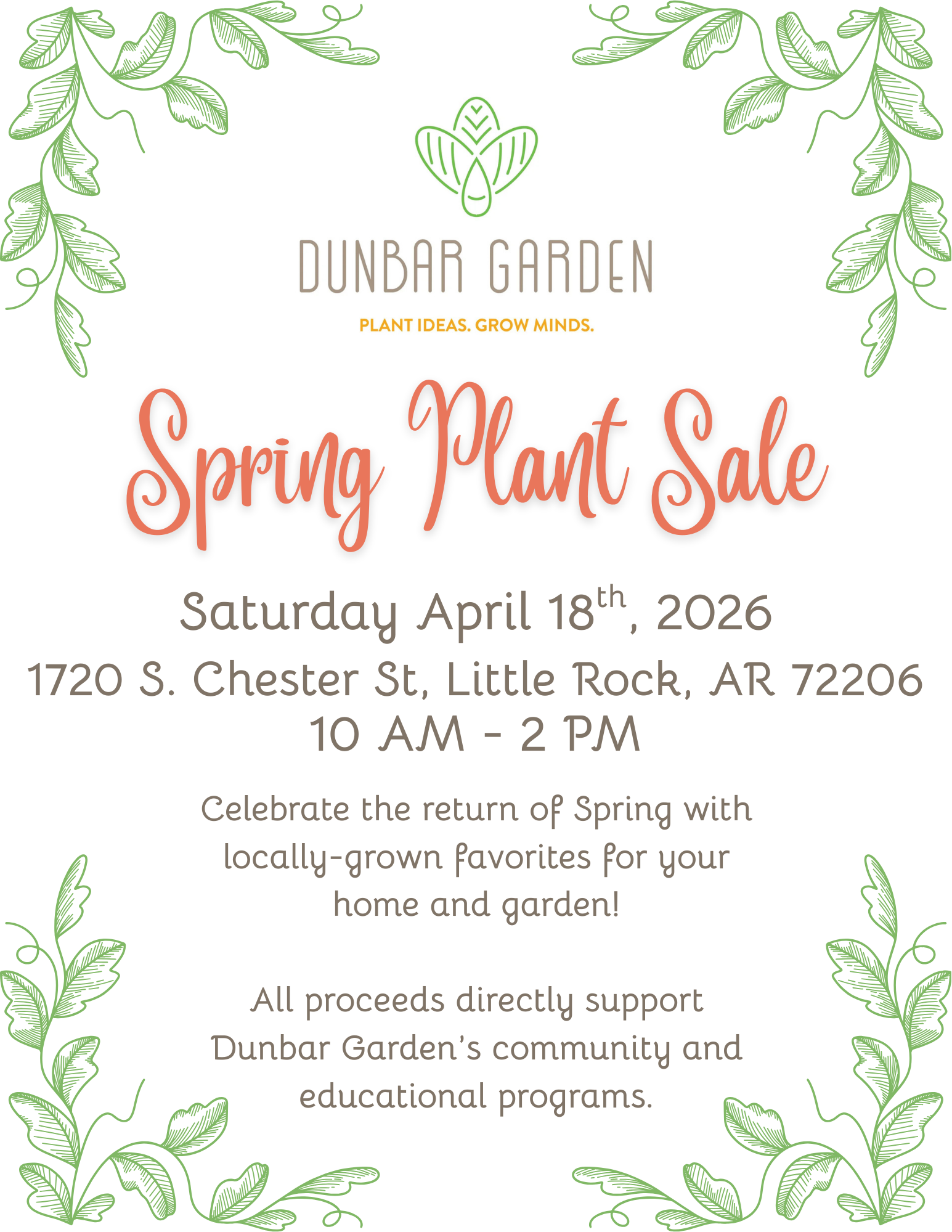 Join us at our Spring Plant Sale on Saturday, April 18th 2026. Browse a beautiful selection of garden and house plants grown right here at Dunbar Garden. Bring a friend, enjoy the garden, and celebrate the return of spring with us!